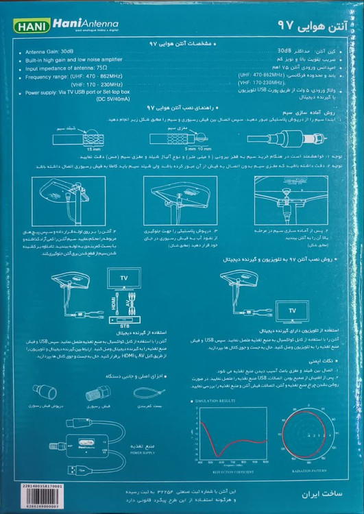آنتن هوایی هانی مدل بدون شاخ دارای گیره برای نصب به میله و لوله می باشد این آنتن را در جهت فرستنده سیگنال های تلویزیونی قرار دهید. این آنتن دو خروجی برای دو سیستم تلویزیونی مجزا دارد و همچنین تغذیه آن از درگاه USB می باشد